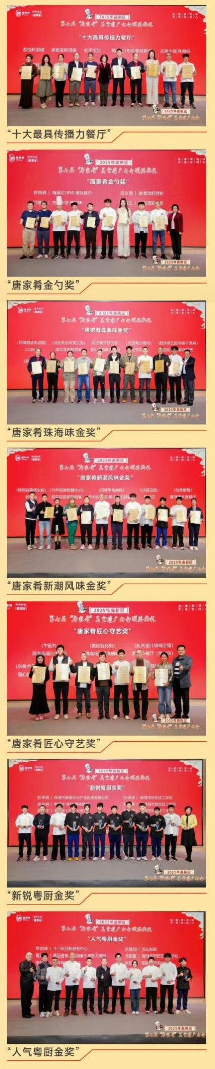 颁奖典礼现场全面回顾了本届活动的丰硕成果,并根据前期评审团评议表决,依次颁发了“新锐粤厨金奖”“人气粤厨金奖”,以及“唐家肴匠心守艺奖”“唐家肴新潮风味金奖”“唐家肴珠海味金奖”“唐家肴金勺奖”和“唐家肴十大最具传播力餐厅”等奖项,表彰在食品安全、厨艺创新及品牌传播方面表现突出的单位与个人。