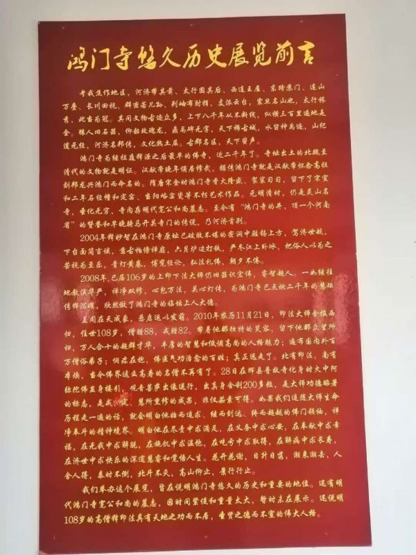 鸿门寺就是刘协怀念汉高祖刘邦龙兴鸿门而命名的,至今有“鸿门寺的井顶一个河南省”的赞誉和“早晚骑马开关寺门”的传说。现寺内仍存北魏山阳令苟祖欢造像碑、北齐千佛造像碑、唐开元年间尊胜陀罗尼经幢、金大定三年尚书礼部牒碣、明代三吨重的大铁钟等。可见鸿门寺遗物之珍贵和规模宏大。在鸿寺北边不远的山顶上横卧着一尊逼真的天然大睡佛,和上院、下院三点一线一字排开十里远,气势非凡。总之,鸿门寺承载着厚重的,有两千年历史的、人杰地灵的佛教文化。